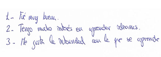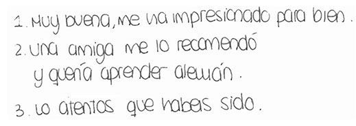 Antes pensaba que el alemán era una lengua muy difícil y que me llevaría mucho tiempo aprenderla. Pero he descubierto que no era así, sino que se trata de una lengua muy lógica. Y además, aprender alemán es más fácil gracias a la labor de los profesores, que en todo momento han sido muy amables y han sido atentos con los alumnos, resolviendo todas nuestras dudas y además explicando con total claridad los conceptos de la lengua alemana. Por ello, opino que mi experiencia en VEITH Institut de Madrid ha sido muy buena, y espero seguir aprendiendo alemán en él.
